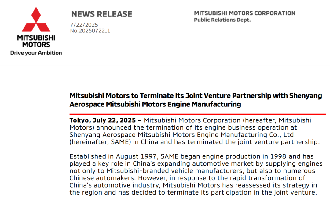 7月22日,三菱汽车发布公告称,鉴于中国汽车产业迅速向电动汽车转型,公司对在华战略重新评估,决定终止与沈阳航天三菱汽车发动机制造有限公司的合资合作关系,并停止该公司的发动机业务运营。这意味着,三菱汽车正式退出中国市场,其长达四十余载的在华汽车生产业务彻底画上句号。
