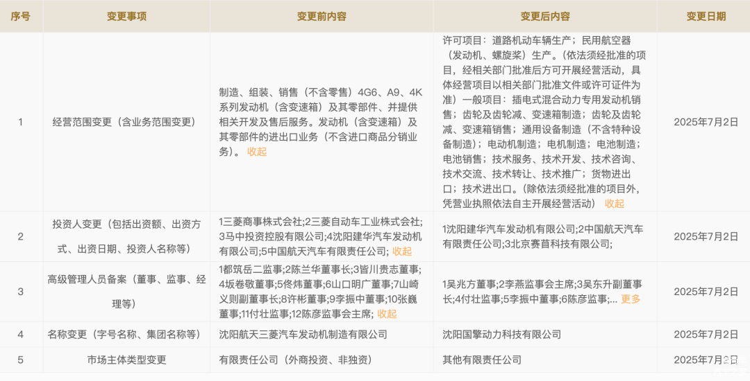 7月2日,“沈阳航天三菱汽车发动机制造有限公司”企业名称变更为“沈阳国擎动力科技有限公司”,三菱商事株式会社、三菱自动车工业株式会社、马中投资控股有限公司退出股东行列,由沈阳建华汽车发动机有限公司、中国航天汽车有限责任公司、北京赛苜科技有限公司分别持股,其中北京赛苜科技有限公司持股49%,公司经营范围也同步变更。