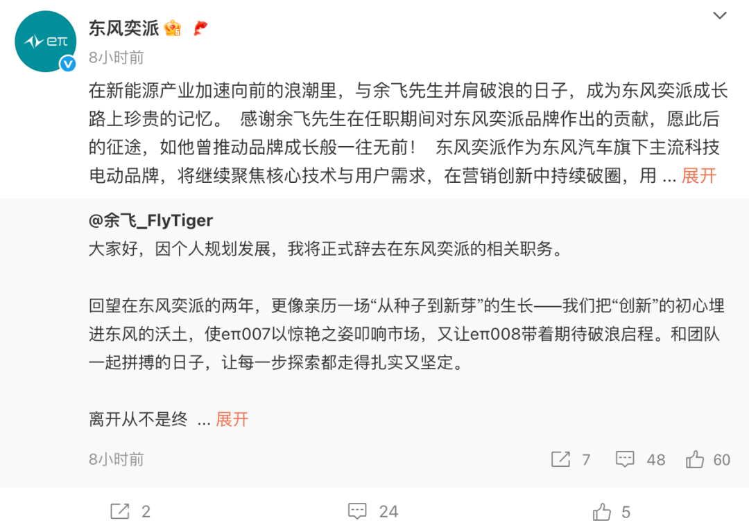 7月22日,东风奕派营销事业部总经理余飞在微博宣布,因个人规划发展,正式辞去在东风奕派的相关职务。余飞在汽车领域经验丰富,其离职后去向备受关注。