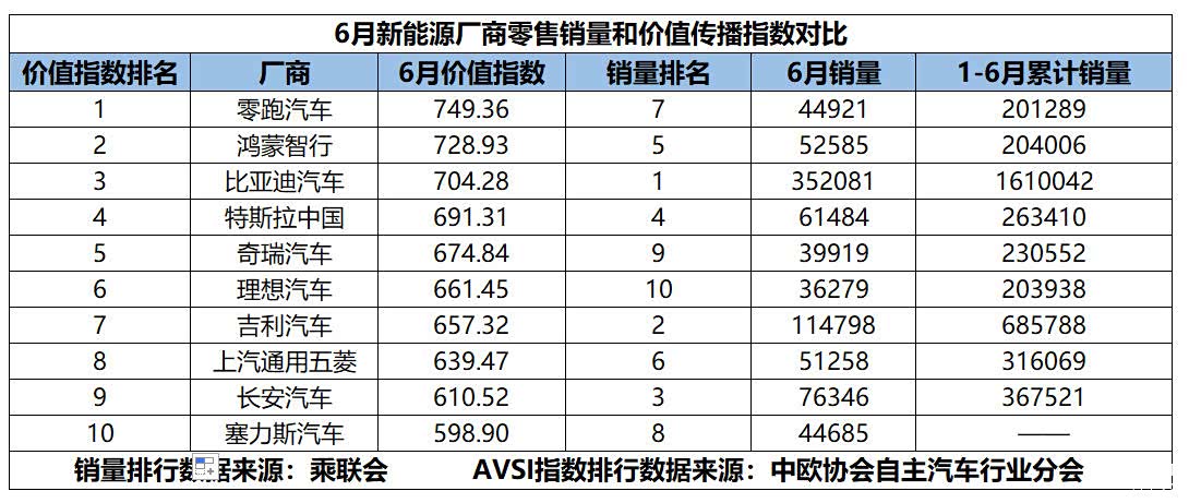 当6月的新能源销量榜单被比亚迪以35.2万辆的绝对优势霸屏时,7月25日,中国欧洲经济技术合作协会自主汽车行业分会联合自主汽车网最新发布的6月新能源厂商价值传播指数却上演了戏剧性反转:零跑汽车以749.36的传播价值指数再度登顶,鸿蒙智行以728.93紧咬其后,而销量冠军比亚迪仅列第三。这场"销量与声量"的错位博弈,正在改写新能源市场的竞争规则。
