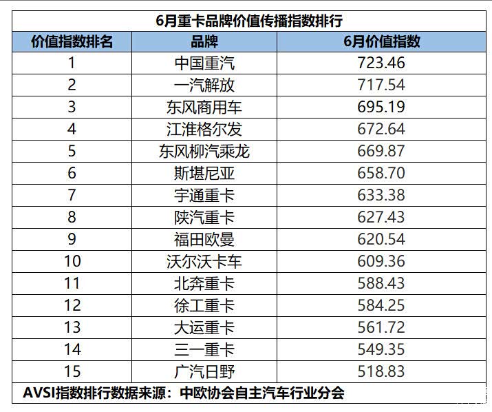 7月25日,当6月重卡市场的竞争尘埃落定,重卡品牌价值传播指数(AVSI)榜单新鲜出炉。中国欧洲经济技术合作协会自主汽车行业分会联合自主汽车网发布的数据显示,中国重汽以723.46的指数值稳坐榜首,一汽解放紧随其后,东风商用车位列第三。在新能源与智能化加速渗透的当下,这份榜单背后,是自主与外资品牌在传播赛道上的策略博弈,更藏着重卡行业价值逻辑的新变化。
