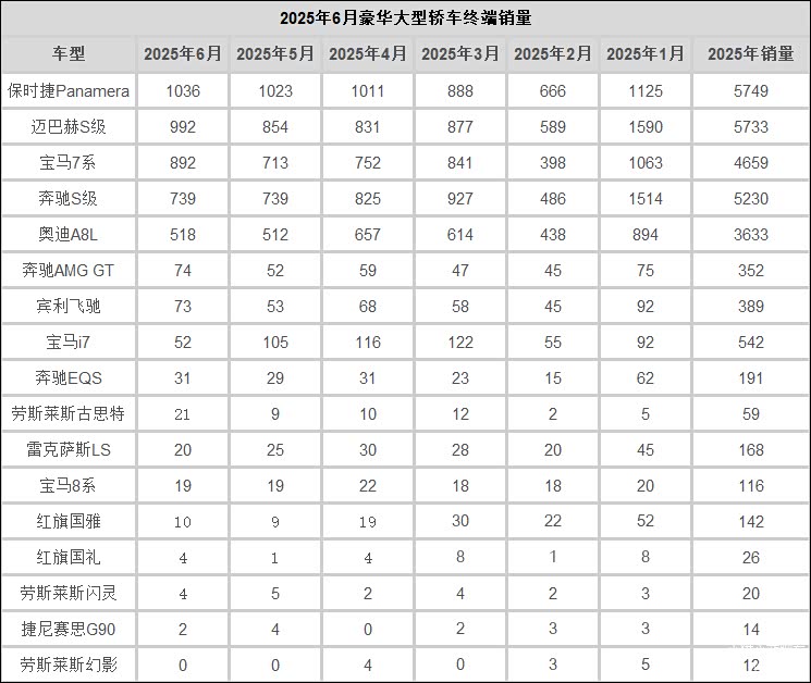 在2025年6月,保时捷Panamera依然表现稳定,连续3个月实现月销量超1000辆,售出1036辆,今年上半年总销量5749辆。作为一款年轻化车型,保时捷Panamera的车主多以自驾车为主。同样来自大众集团的奥迪A8L,6月终端销量518辆,前6个月总销量3633辆,终端优惠较大且产品力不差,让A8L成为一个不错的选择。宾利飞驰的6月终端销量诶73辆,上半年总销量389辆,市场存在感不高。