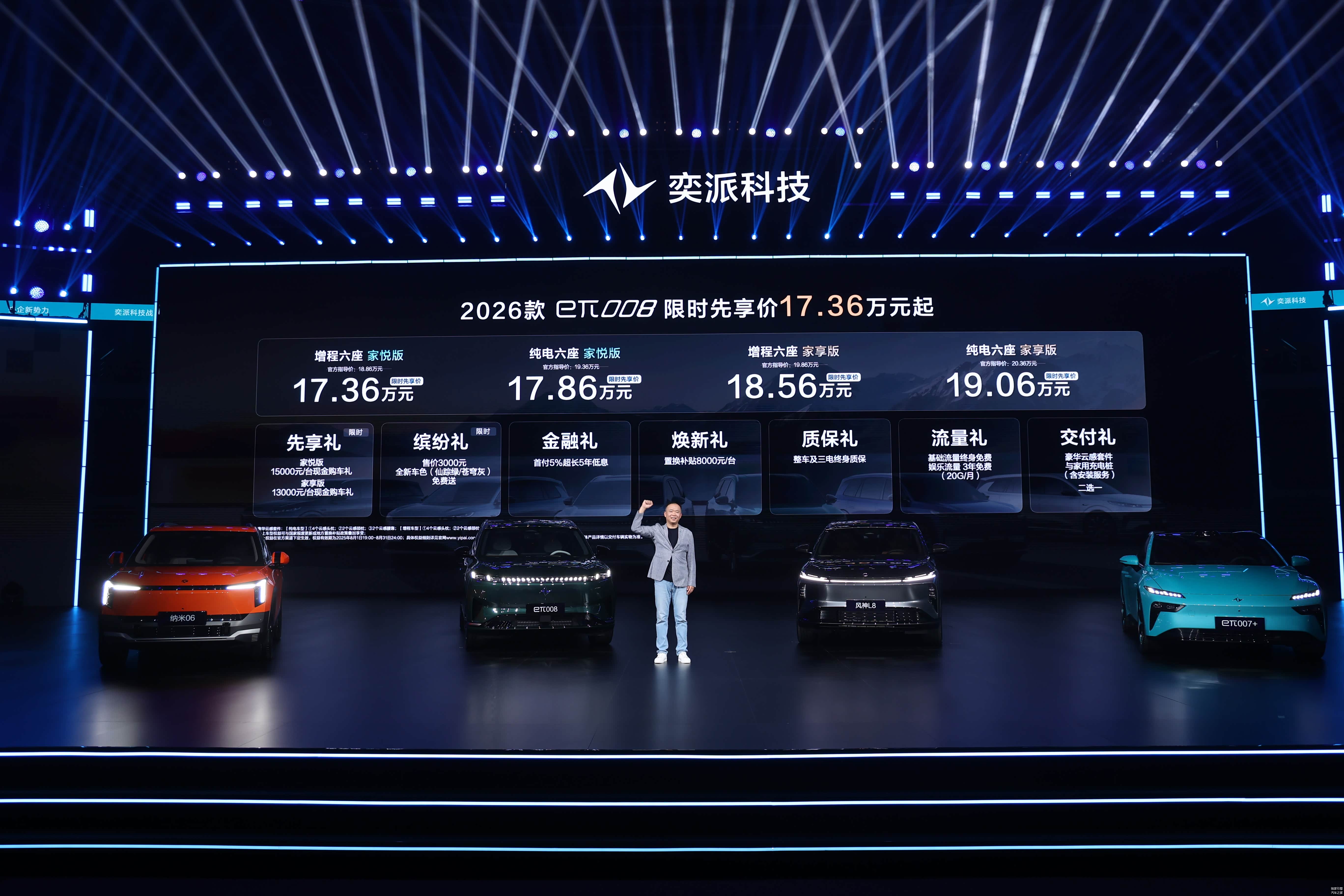 2026款东风奕派eπ008家悦版,真三排大六座布局(5002mm车长+3025mm轴距,起步即高配。新车全系标配高通骁龙SA 8295P车规级芯片,搭载强大的SOA天元智舱、双AI语音大模型等智能科技配置,增程官方指导价18.86万元,限时先享价仅17.36万元;纯电官方指导价19.36万元,限时先享价仅17.86万元。
