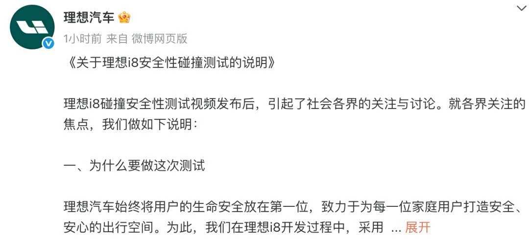 8月3日晚间,理想汽车官博发布《关于理想i8安全性碰撞测试的说明》称,本次测试委托第三方权威机构——中国汽车工程研究院股份有限公司(以下简称“中国汽研”)执行高强度碰撞测试,并通过视频形式,透明、真实地向用户展示测试过程和结果。