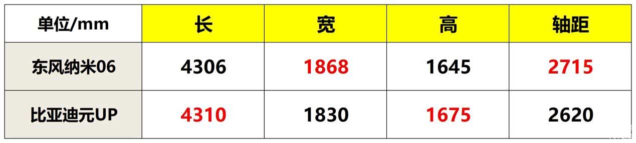 东风纳米06和比亚迪元UP虽说在车身尺寸上差别不大,但在关键数据——轴距上的差距还是比较明显,从实际体验来说,拥有2715mm轴距的东风纳米06,其空间表现会更好。依据在于,我个人净身高1.78米,两款车的头部空间都能满足我,东风纳米06的腿部空间更宽敞,完全可以满足日常家用,大家可以对照我的身高做参考,如果你身高1.85+,建议亲自去体验对比一下。