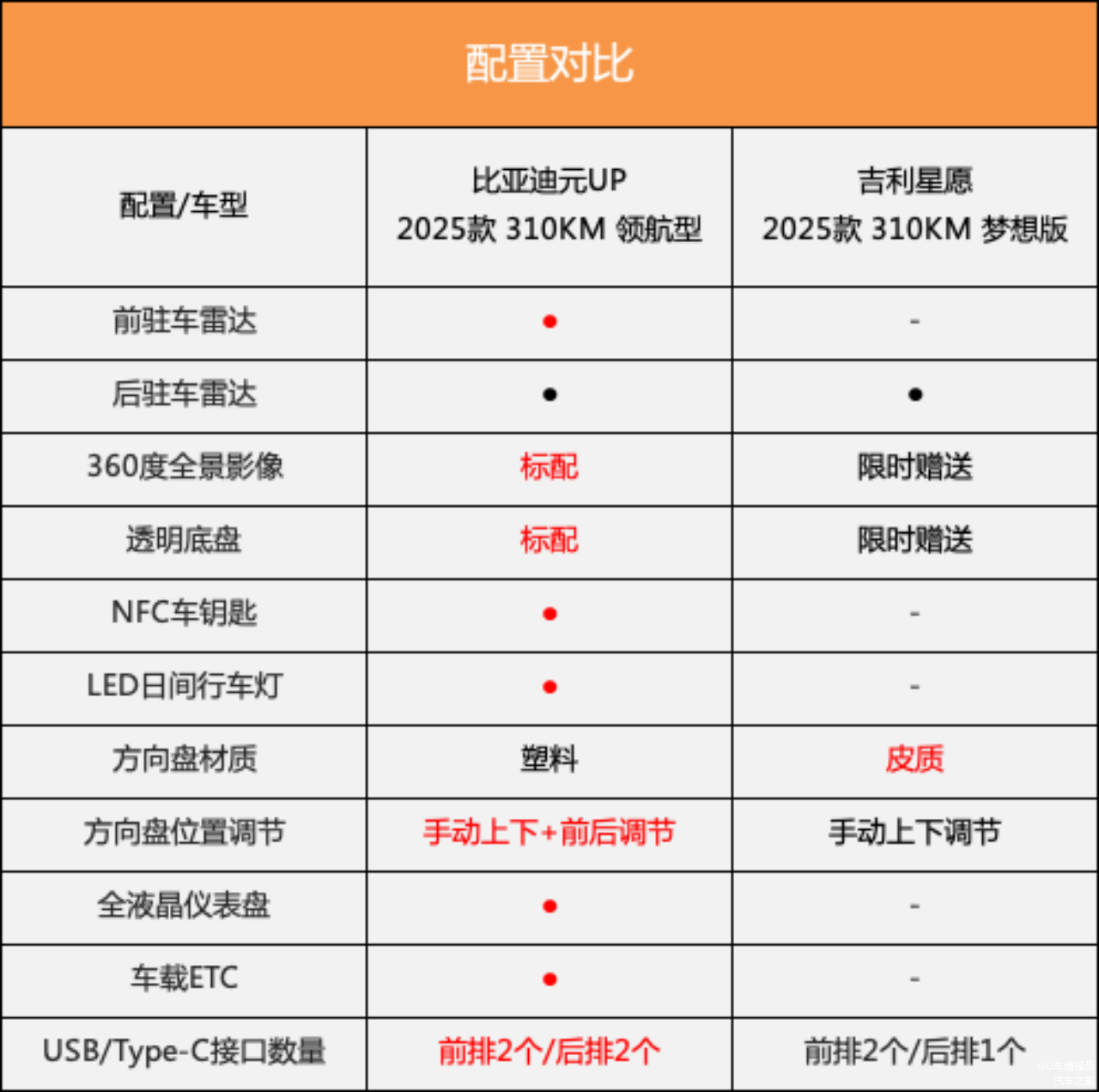电动化潮流起势后,改变了代步车的市场逻辑。在燃油车时代,七八万的预算只能买到比较粗糙的小车,而现在可以买到体验丰富的电动车,还能大大降低用车成本。本文给大家带来两款纯电产品,只需七八万,来自自主头部品牌,它们是比亚迪元UP(2025款 310KM 领航型)和吉利星愿(2025款 310KM 梦想版),指导价分别为7.48万元和7.68万元。