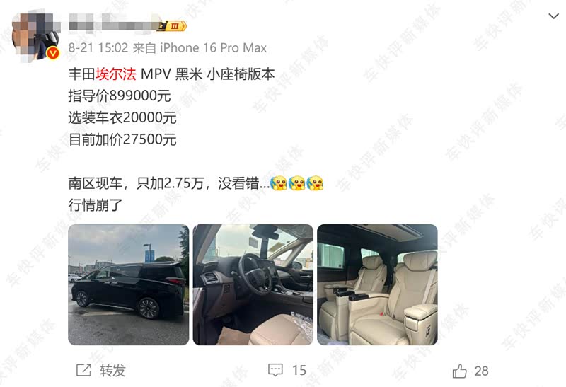 有汽车博主称现在的丰田埃尔法只需要加价2.7万元,并表示行情崩了。但需要说明的是,加价2.7万元的丰田埃尔法并非2025款双擎黄金版,而是2024款官方指导价为89.9万元的双擎尊贵版车型。