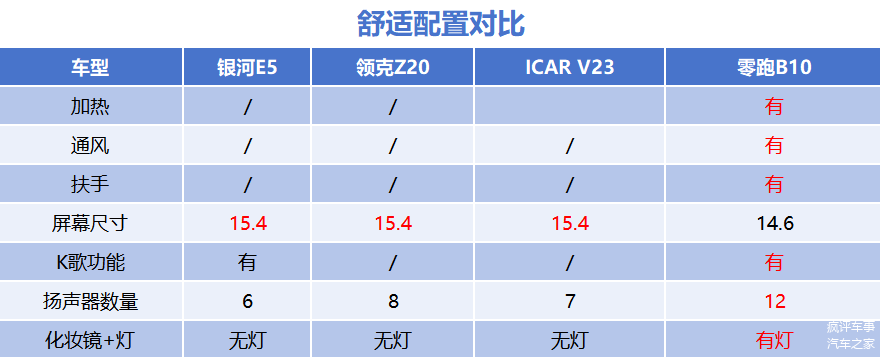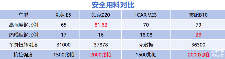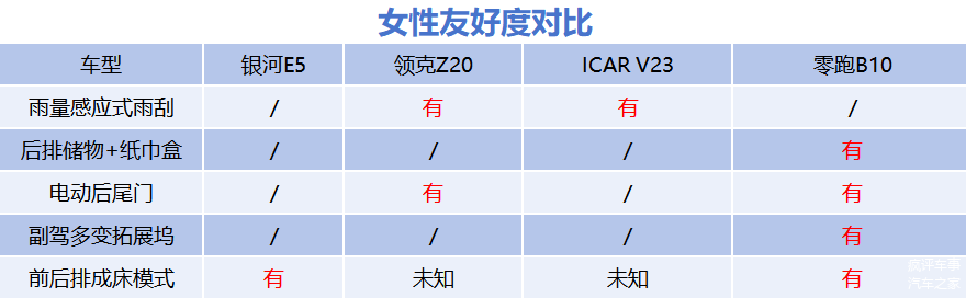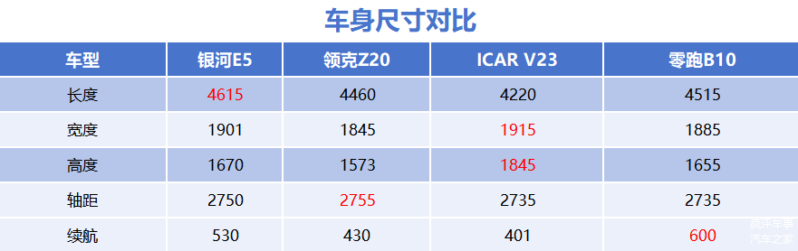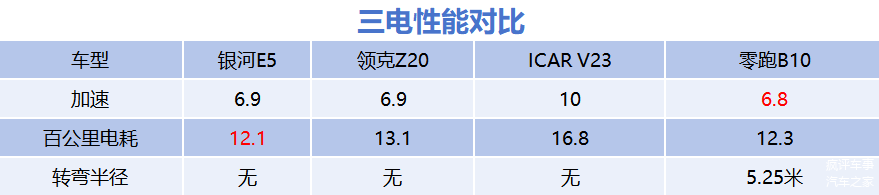 因此,在上述的产品对比中,银河E5得分3分,零跑和ICAR V23各得2分,领克Z20得1分。
