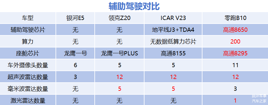 零跑B10竟然在12万的价格区间就给到了激光雷达的配置,简直是不讲道理、而且,把同行20万以上级别都未必给到的8295芯片,下放到了12万级别的零跑B10上,也是丧心病狂。因此买车比较关注智能化的女生,应该会对B01有更多的好感。因此不论是硬件的诚意还是后期升级的潜力来说,零跑B10本轮拿下3分都是毫无疑问的,ICAR V23拿下2分,其他车型仅得一分。
