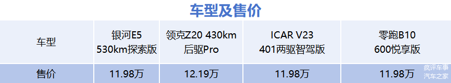 在这个价格区间,如果说为男士去考虑一款车型,那选择的确可以称得上是眼花缭乱,但是如果为女生选择一款代步车型,说实话还是有些难的。单独从产品设计上来看,有女生审美迎合的车型都不多。综合各方面因素,我们选择银河E5、领克Z20、 ICAR V23(图片 | 参数 | 询价)、以及零跑B10这四款售价都在12万左右的车型,进行真实数据对比,看看在产品的各个方面,谁才是更适合小姐姐的那辆“梦中情车”。