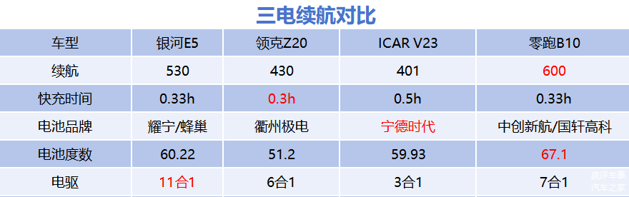 在更为基础的三电相关数据上,5个车型的表现都互有优劣,比如ICAR V23续航最短快充最慢,电驱系统也仅仅只是3合1,但是却搭载了宁德时代电池。因此综合来看,银河E5、零跑B10同时拿下3分,而领克Z20和ICAR V23同时得到2分。不知道大家有没有异议?