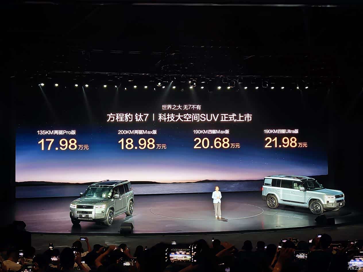 9月9日晚,方程豹正式推出全新SUV 钛7(图片 | 参数 | 询价),新车共推出四个版本,售价区间为17.98~21.98万元,比此前网传20~25万元的价格区间还要低。作为一款中大型SUV,方程豹钛7给出这样的指导价确实有吸引力,毕竟其他具有硬派越野风格造型的中大型新能源SUV,其起售价怎么说也要在18万元以上。