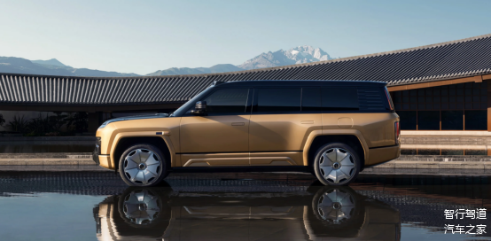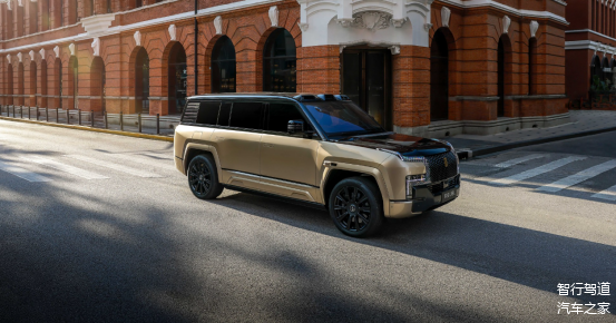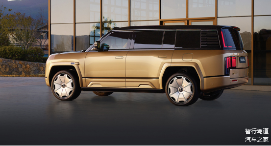车身侧面,线条平直流畅,双色车身营造出悬浮式视觉效果,采用车身同色轮眉,侧裙上方增加金色饰条装点,增添了精致感。23英寸锻造轮毂搭配悬浮轮芯盖,凸显了车侧的力量感,轮眉处的金色涂装与车身呼应。车身尺寸为5400×2049×1921mm,轴距为3250mm,符合全尺寸行政SUV的体量感。