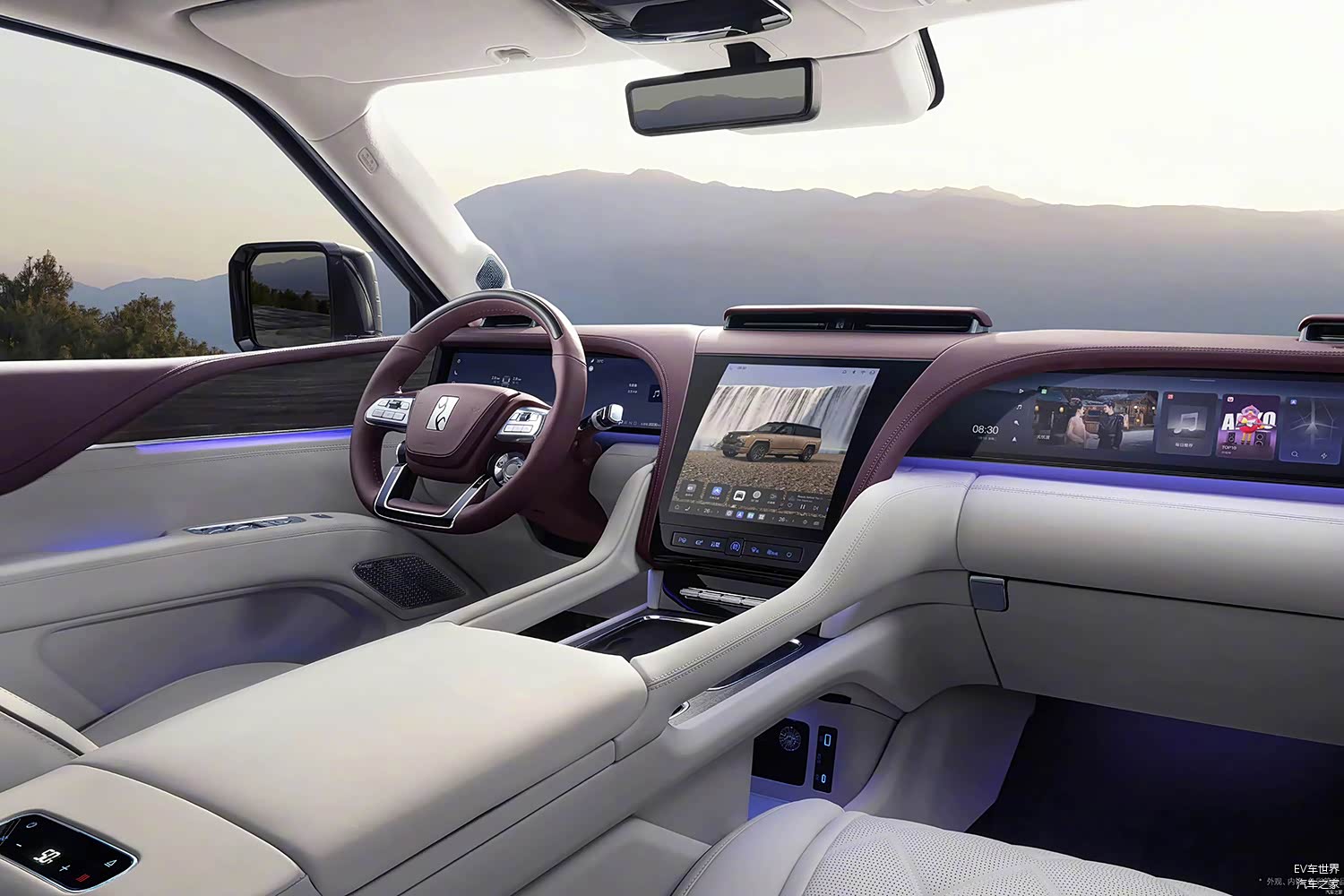 仰望U8L的内饰延续以“星环座舱”为设计核心,提供白紫以及黑棕两款内饰配色。中控台搭载了23.6英寸液晶仪表屏+12.8英寸中控屏+23.6英寸副驾娱乐屏。