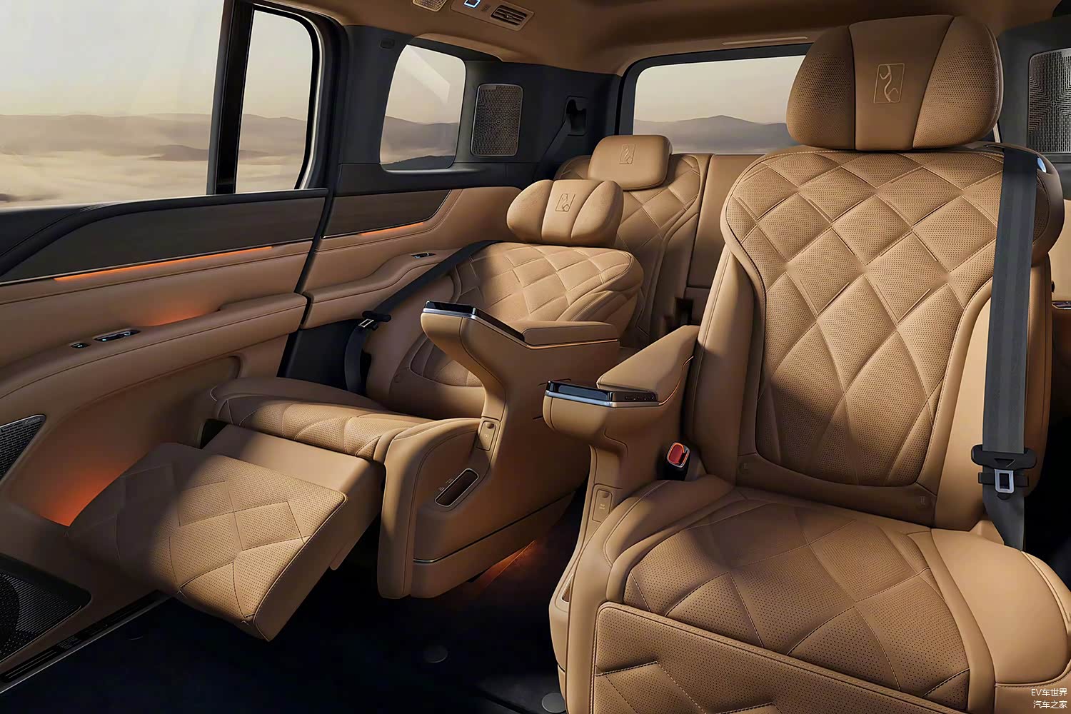 车内采用了2+2+2的6座布局,座椅采用棕色皮质面料进行包覆,并带有菱形座椅纹路;第二排两张独立座椅的内侧扶手带有液晶控制屏,可一键切换零重力模式。此外新车还配备了大尺寸吸顶屏、车载冰箱等舒适性配置。