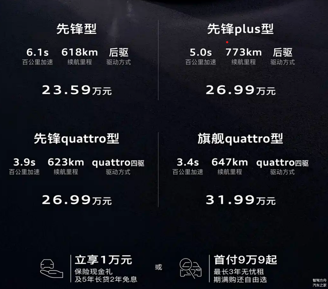 ☆☆☆☆奥迪E5 Sportback 2026款 先锋quattro 型:价格同样 26.99 万元,与先锋 Plus 型价格相同但配置侧重不同。此款为双电机四驱车型,动力性能提升,在操控和应对复杂路况上更具优势,适合喜欢驾驶乐趣、对动力和四驱系统有需求的消费者。