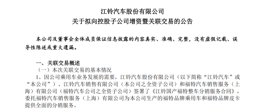 此前江铃汽车发布公告,宣布对福特品牌乘用车及皮卡产品的渠道资源进行战略性调整:委托福特销售服务公司全面负责分销服务。与此同时,江铃汽车与福特共同向江铃福特汽车科技(上海)公司增资以清偿债务。