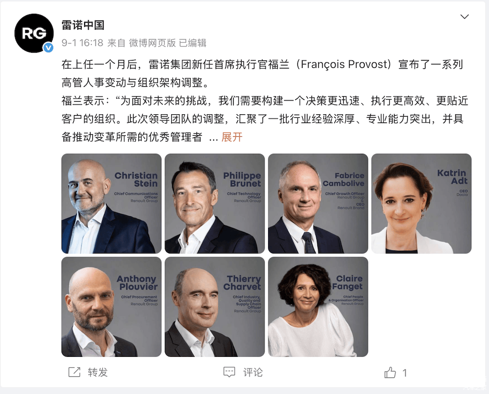 这其中有两起值得关注,9月初,雷诺集团完成近年最大规模高管重组。涵盖品牌、技术、采购,以及人力等众多领域。此次高层架构的迅速重组,由新任CEO福兰主导,此举或为了更好应对欧洲市场需求疲软,加速电动化布局。