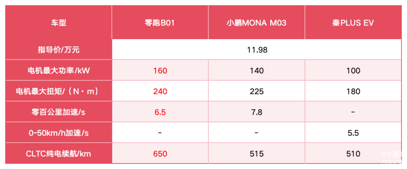首先,我们对比三款车型的关键动力参数,如下图所示。结果一目了然,零跑B01在性能和续航这两个方面都比同价位的小鹏MONA M03和秦PLUS EV更有优势。