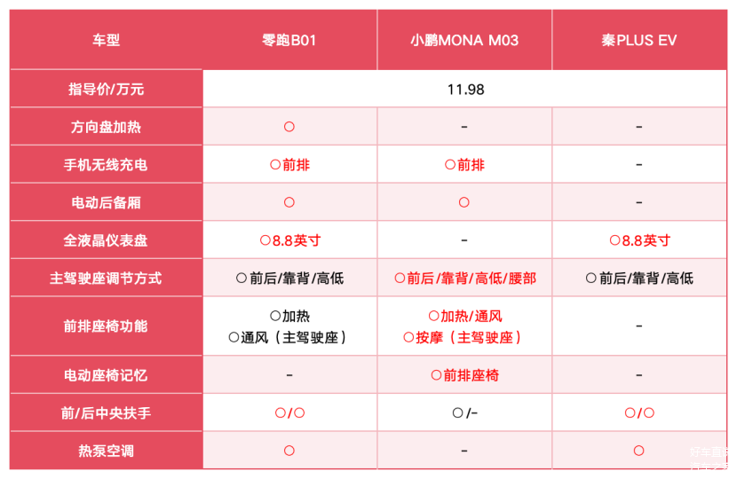 这三款车的定位高度重叠,那么它们的对比就可以为消费者提供参考。为了更清晰地看出三款车型的实力,好车君选择了指导价均为11.98万元的零跑B01 650激光雷达版、小鹏MONA M03 515 长续航Plus,以及秦PLUS EV510KM领先型。