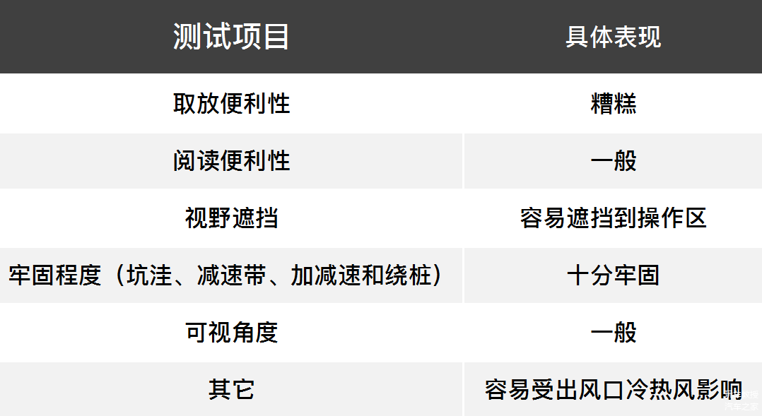 不过它仍然要面对的是出风口的冷热风干扰问题,而且我们这一款由于夹紧力度不够,因此在颠簸坑洼测试时容易掉落,算是一个不太好的地方,不过至少这一种实现了单手取放。