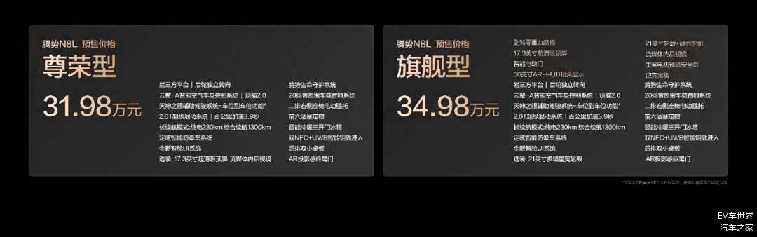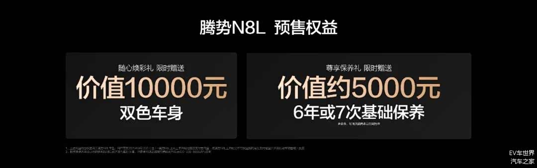 9月26日, 腾势N8L(图片 | 参数 | 询价)正式开启预售,预售价31.98至34.98万元。此外官方还带来了预订即可获赠价值10000元的双色车身焕彩礼,以及价值5000元的基础保养的尊享万元专属礼遇。