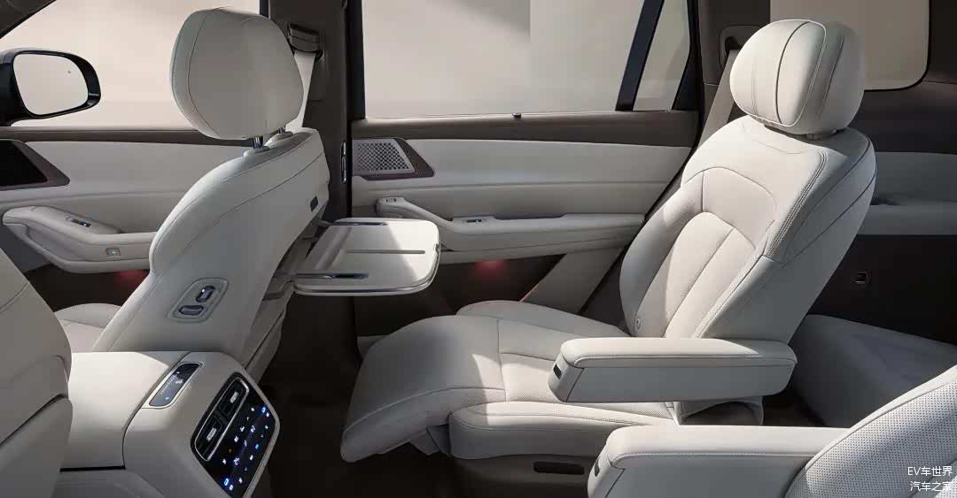 第二排座椅右侧也同样配备电动女王腿托,并搭载了17.3寸后座舱娱乐屏、智能冷暖三开门冰箱以及标配双小桌板,甚至还支持无麦K歌2.0。