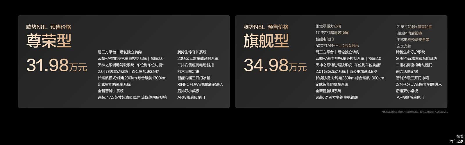 腾势N8L正式开始预售,它的预售价在31.98万到34.98万元之间,定位是家庭豪华伙伴。它和腾势N9一起组成了旗舰豪华双子星矩阵,分别针对不同的细分市场。N9主要突出科技性能,N8L则专注于家庭安全和豪华舒适享受。
