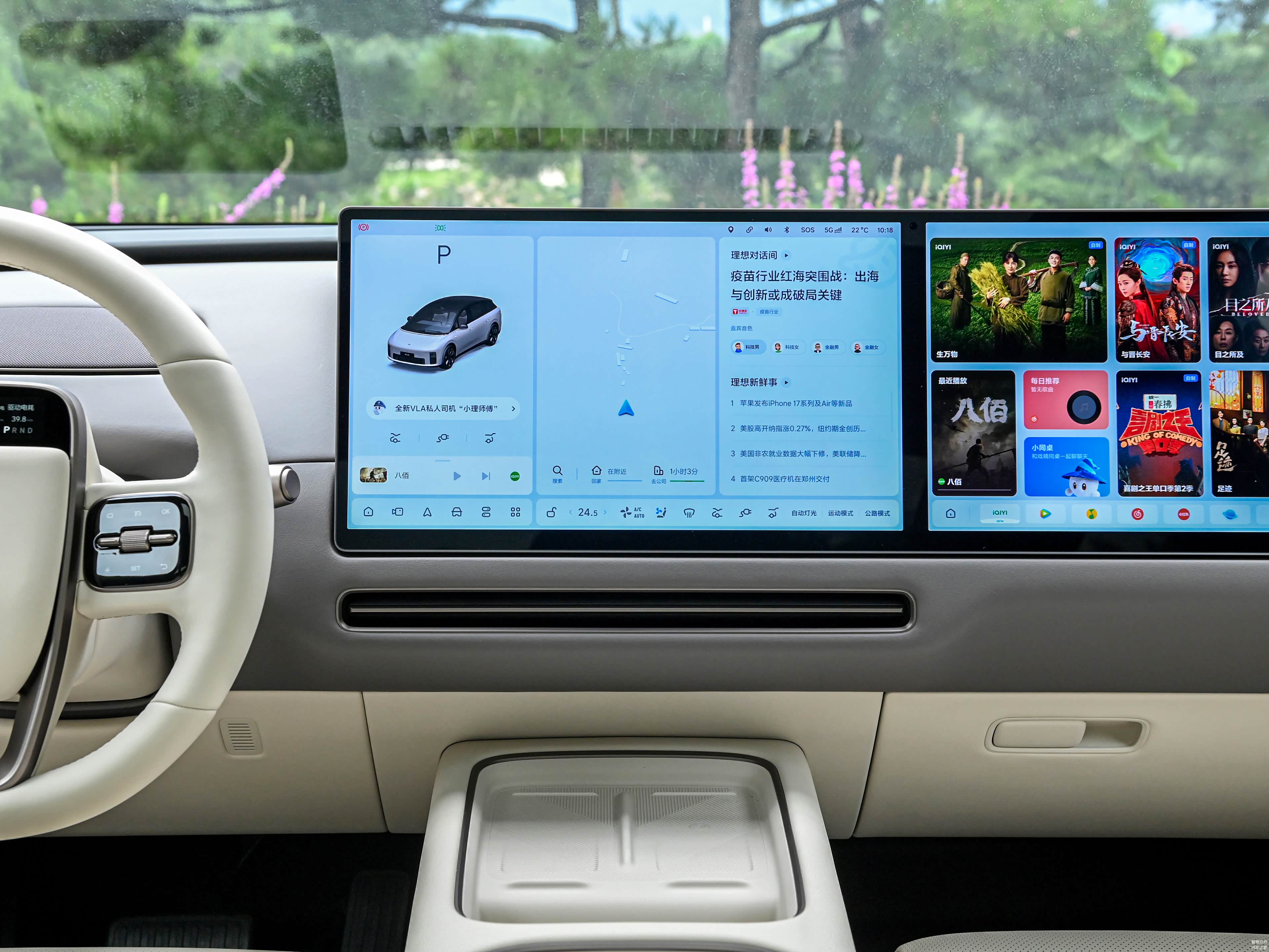 前排搭载双15.7英寸OLED 3K联屏(中控屏+副驾娱乐屏),配合HUD抬头显示系统,形成三屏交互矩阵。屏幕依托高通8295P芯片,语音指令响应延迟低于0.8秒,操作流畅度行业领先。中央出风口采用横向无拨片设计,推测为电子调节模式,与屏幕区域融为一体,强化极简视觉效果。