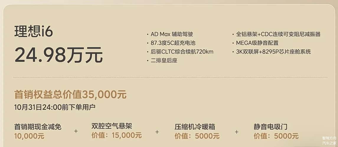 9月26日, 理想i6(图片 | 参数 | 询价)正式上市,新车仅推出1款车型定位纯电动中大型SUV,售价为24.98万元,标配即顶配。上市5分钟大定破万.新车将于9月27日开启交付。首销期(10月31日24:00前下单用户)赠送价值35000元权益,包括现金减免10000元、赠送价值15000元双腔空气悬架、赠送价值5000元压缩机冷暖箱和赠送价值5000元静音电吸门。