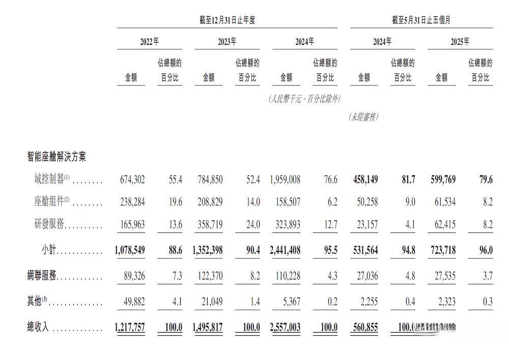 2024年其智能座舱解决方案收入为24.41亿元占比95.5%,包括域控制器(19.6亿元收入)与座舱配件(1.59亿元)两部分,其智能网联服务在2024年收入为1.1亿元,占比4.3%。