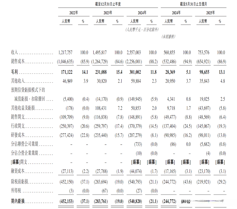 不过,值得注意的是,该公司净亏损呈波动扩大态势,2022-2024年净亏损分别为4.52亿、2.84亿、5.41亿元,三年间亏损了12.77亿元,2025年前5个月净亏损为2.2亿元。公司解释亏损主要因研发投入高、客户付款周期长及毛利率下降。