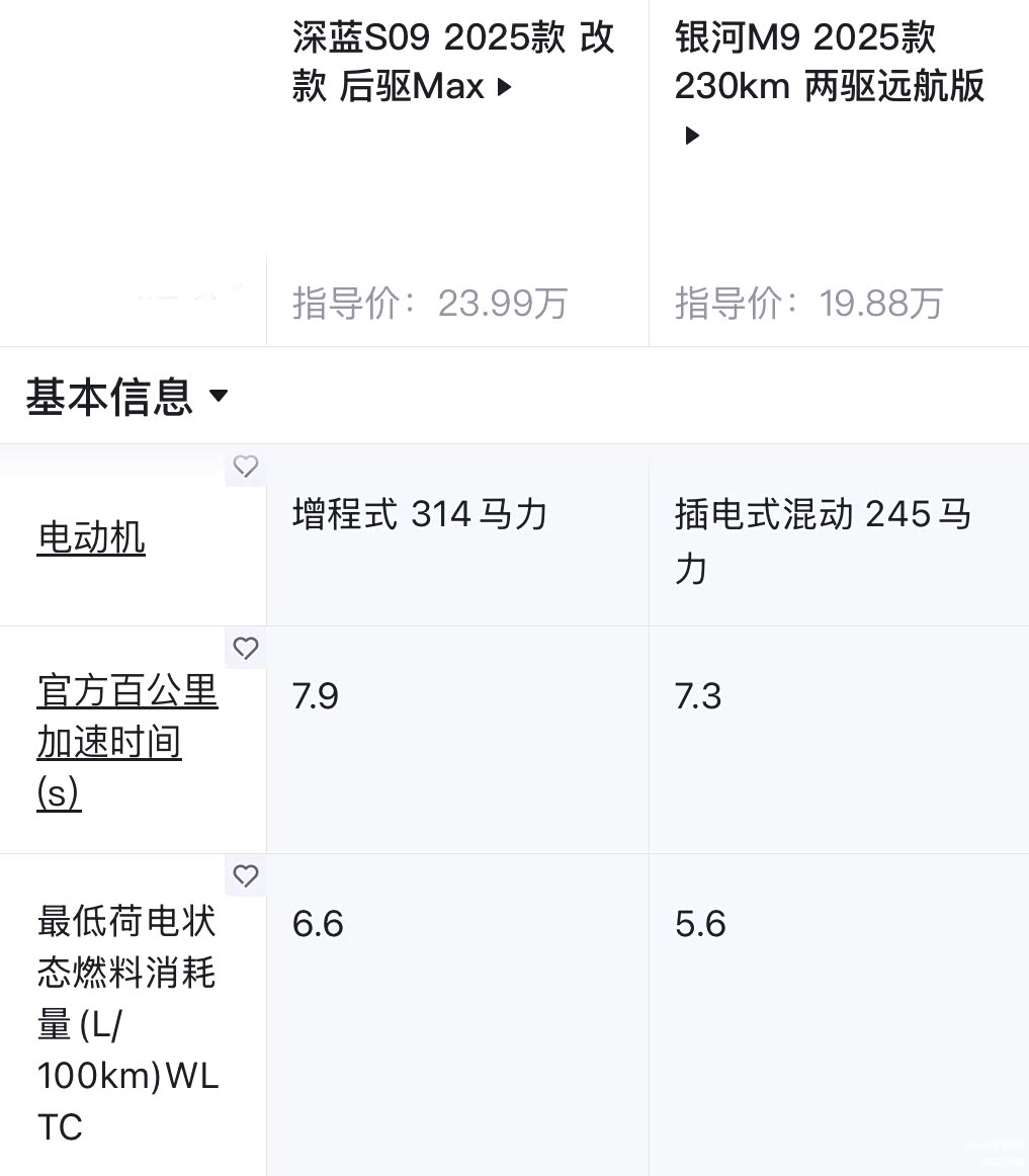 那作为对比参考,同样是增强动力的中大型的SUV,深蓝S09两驱版,零百加速时间为7.9秒。风云T11的直接竞争对手银河M9,它的零百加速时间为7.3秒。二者的动力表现,明显好于风云T11。