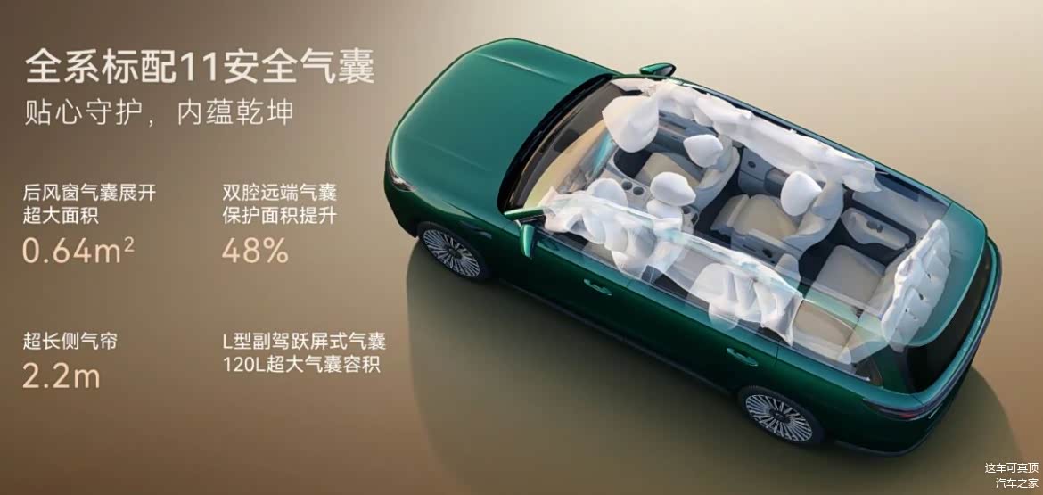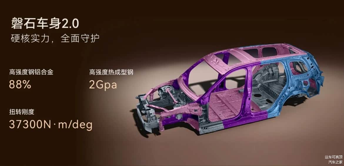 首先第一点,安全性方面,做的真的挺到位。全系都标配11个安全气囊,这气囊数量,大部分30万级的车型都难以做到。而且这个磐石车身2.0,高强度钢运用占比达到88%,扭转刚性达到了37300N·m/deg,整个车身框架,在同级车型中,绝对算是佼佼者。