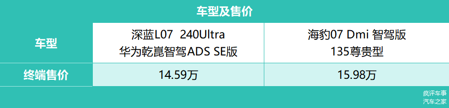 为了更好的进行对比,我们选择终端价格为14.59万的深蓝L07 240Ultra华为乾崑ADS SE版和终端售价为15.98万的海豹07 DM-i的135尊贵型两款车型进行对比。看看到底哪款车在这个价格才是更具有质价比的选择!