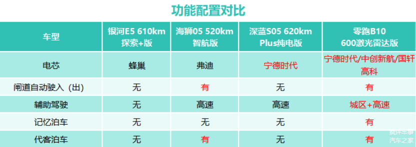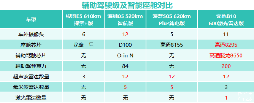 那如果说刚才对比的车型中,零跑B10拥有更全的欧盟认证是他的产品力的展现。那同价格区间他对比以上几款车型又多了什么样的配置,让B10足以算得上是一款“有诚意”的产品呢?我们选取售价都在12万多的银河E5 610km探索+版本、海狮05EV 520km智航版、深蓝S05 620kmPlus纯电版以及零跑B10 600km激光雷达版来做一下配置上的简单对比,看看能不能发现一些端倪!