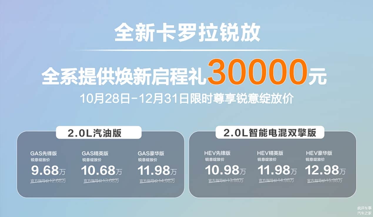 全新卡罗拉锐放价格体系极具竞争力,配合“焕新启程礼30000元”限时权益,进一步降低购车门槛。