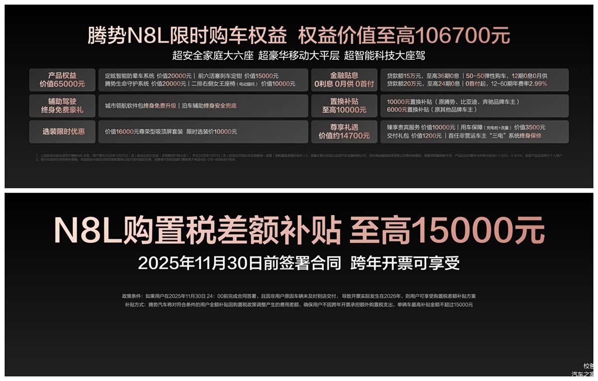 腾势N8L, 一台家人全票通过的车。即日起至11月30日,购车享三年免息、最高1万置换补贴,更承诺「延迟交付补购置税差额」!腾势总经理李慧放话:“我们要让每一分钱都花在刀刃上,用硬核技术重新定义家庭豪华SUV!“
