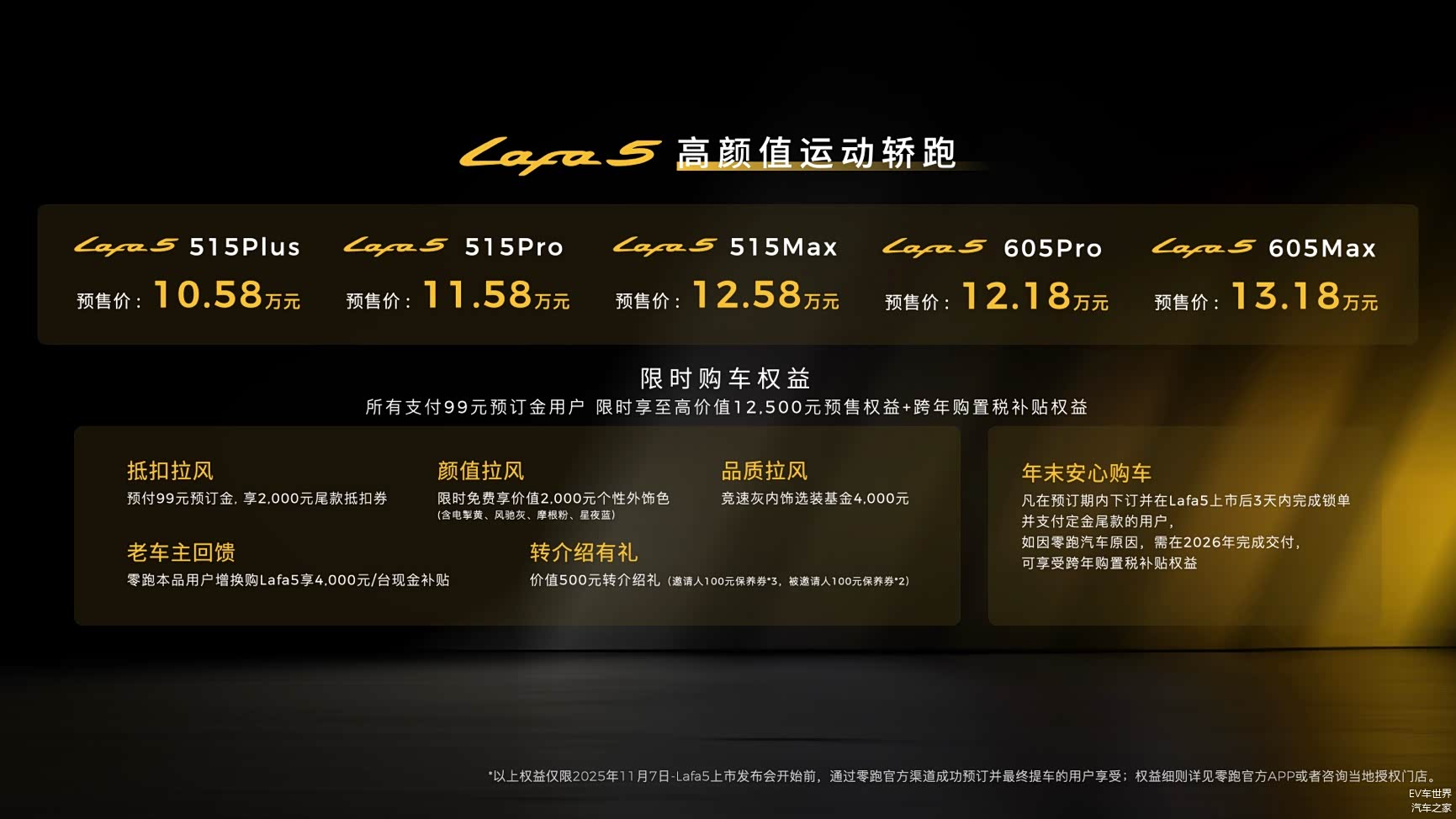 2025年11月7日晚,零跑全新的个性战略新品—— 零跑Lafa5(图片 | 参数 | 询价)开启预售,预售价区间为10.58-13.18万元。