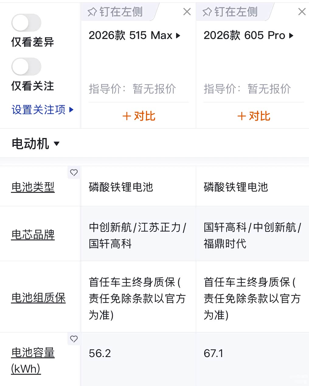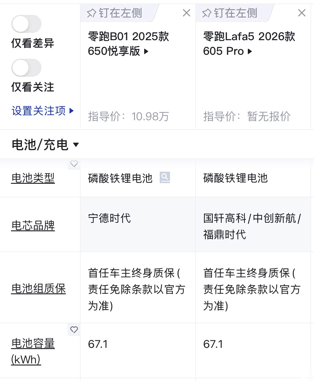 零跑B01有一个入门的430续航版本,拿掉这个版本再对比,零跑Lafa5和零跑B01的电池容量,也都是一样的,均为56.2度和67.1度 两种版本。最大的区别在于零跑B01的长续航版,用的是宁德时代的电池,而零跑Lafa5的长续航版,用的是二线品牌电池混装。