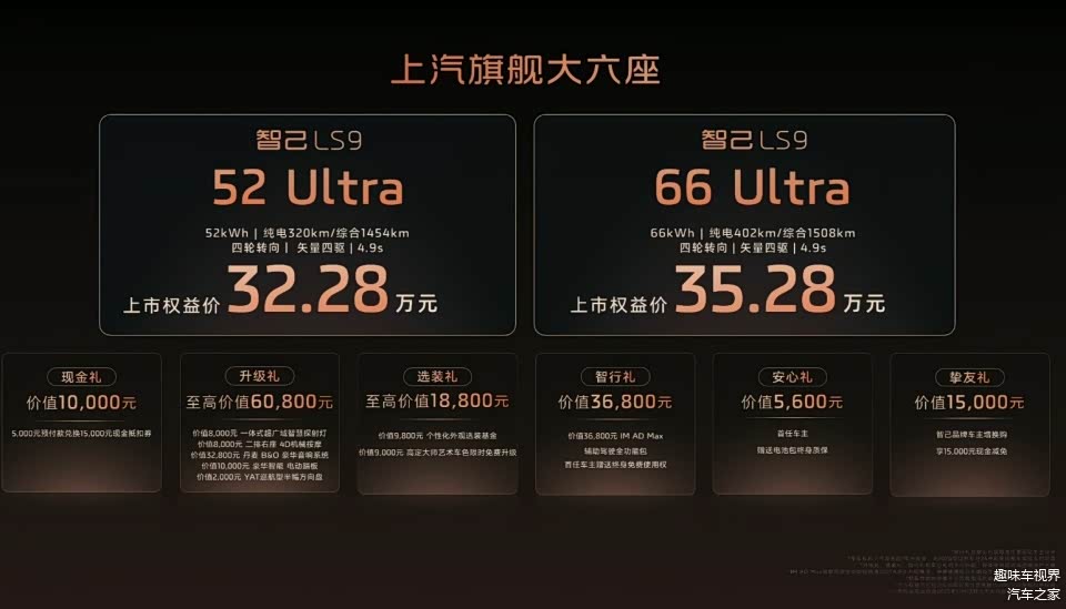 终于来了!智己汽车旗下全新六座增程SUV车型—— 智己LS9(图片 | 参数 | 询价)正式上市发售,值得注意的是,新车将于11月下旬开启交付。新车共推出两款配置车型,指导价分别为33.28万元和36.28万元,上市权益价分别为32.28万元和35.28万元,以极具诚意的价格释放核心竞争力。作为智己品牌的技术旗舰,智己LS9搭载“恒星”超级增程技术及灵蜥数字底盘3.0等更为丰富的配置,CLTC纯电续航最高达到了402公里,为消费者带来兼顾性能与经济性的全新选择。
