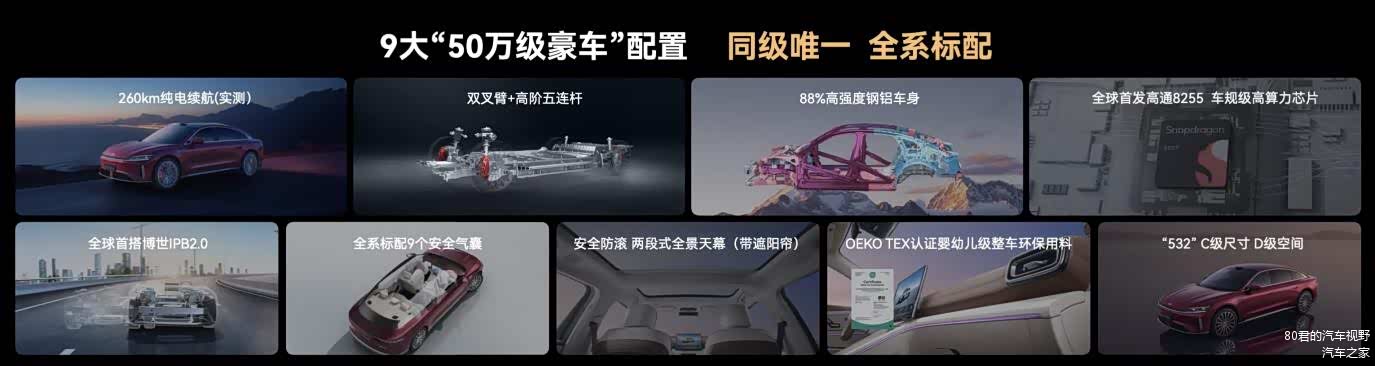 即便长途出行,1200km+的综合续航也能减少补能次数,30%-80%快充仅需14.5分钟,喝杯咖啡的时间就能快速回血。88%高强度钢铝打造的磐石车身,加上100%覆盖前乘员舱的2000MPa热成型钢,配合9个安全气囊,给全家出行筑起全方位防护。