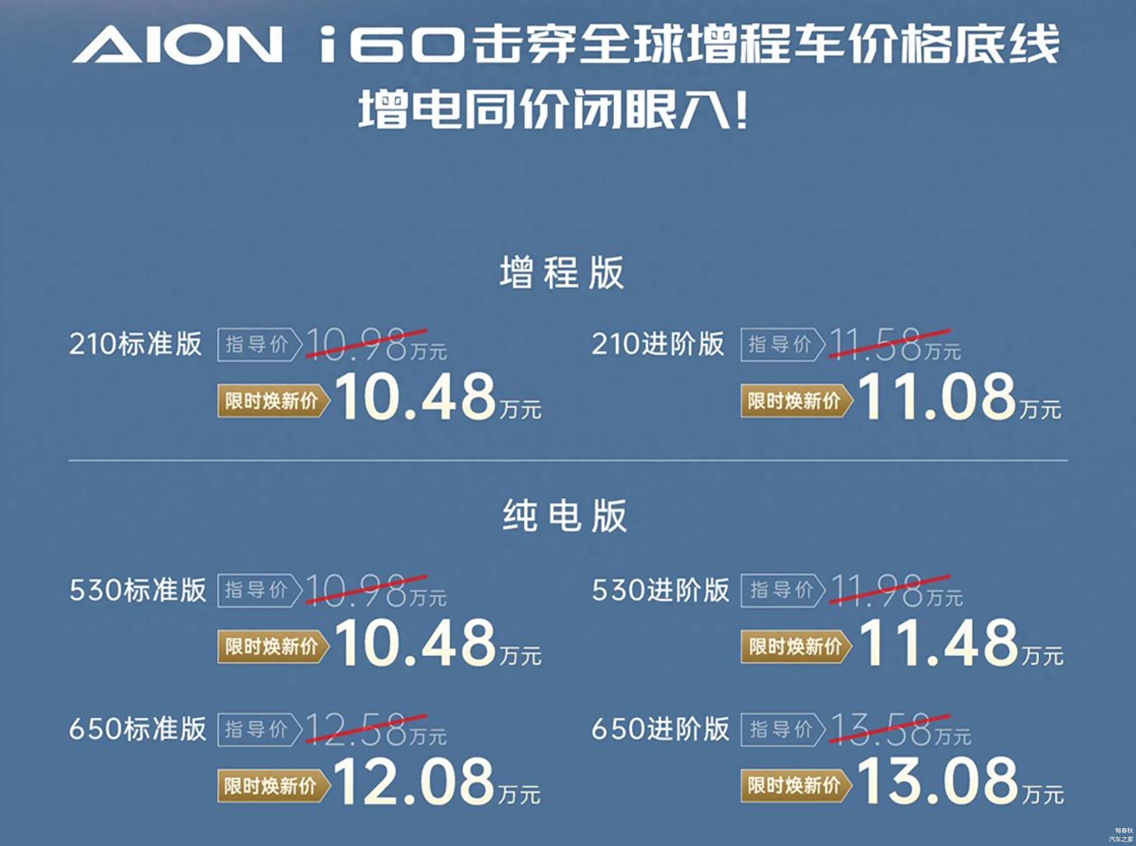 11月16日,广汽AION旗下一款全新紧凑级SUV—— AION i60(图片 | 参数 | 询价)正式上市,一共6个版本,其中纯电版4款,增程版2款。增程版两款车型售价分别为10.98万和11.58万元,置换补贴价后分别为10.48万和11.08万元。纯电版4款车型价格区间从10.98万到13.58万元,置换补贴后降5000元,从10.48万到13.08万元。