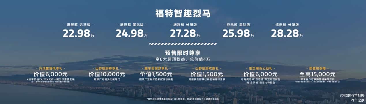 当一辆车既能陪你穿梭都市早高峰,又能带你征服荒野秘境,还能秒变移动露营地,这样的全能体验终于被 福特智趣烈马(图片 | 参数 | 询价)实现了。2025年11月18日,这款烈马家族首款新能源车型正式开启预售,增程版22.98万元起、纯电版25.98万元起的价格,配上六大预售权益,直接让“可城、可玩、可野”的生活方式触手可及。
