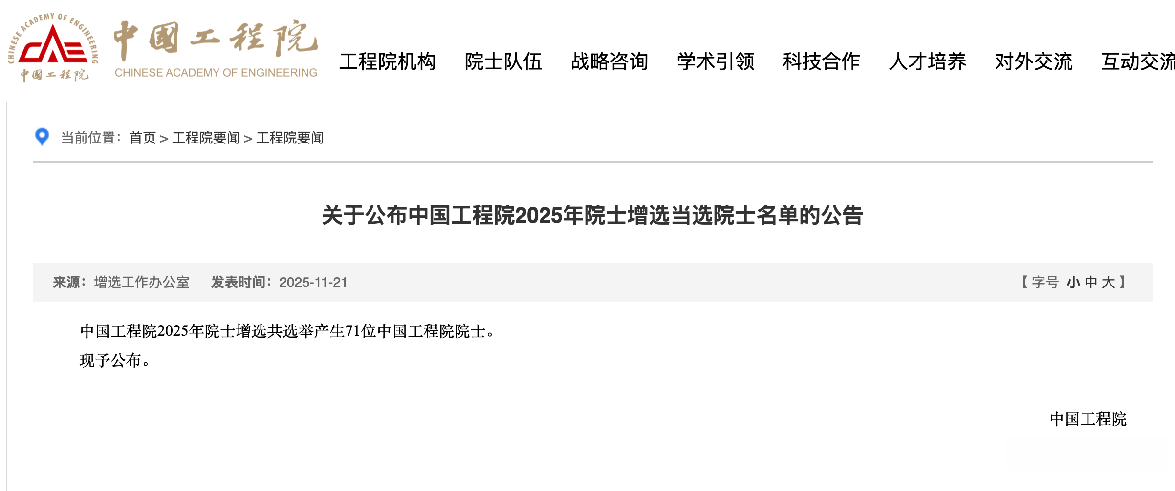 车东西11月21日消息,就在刚刚,中国科学院与中国工程院正式公布了2025年院士增选结果。