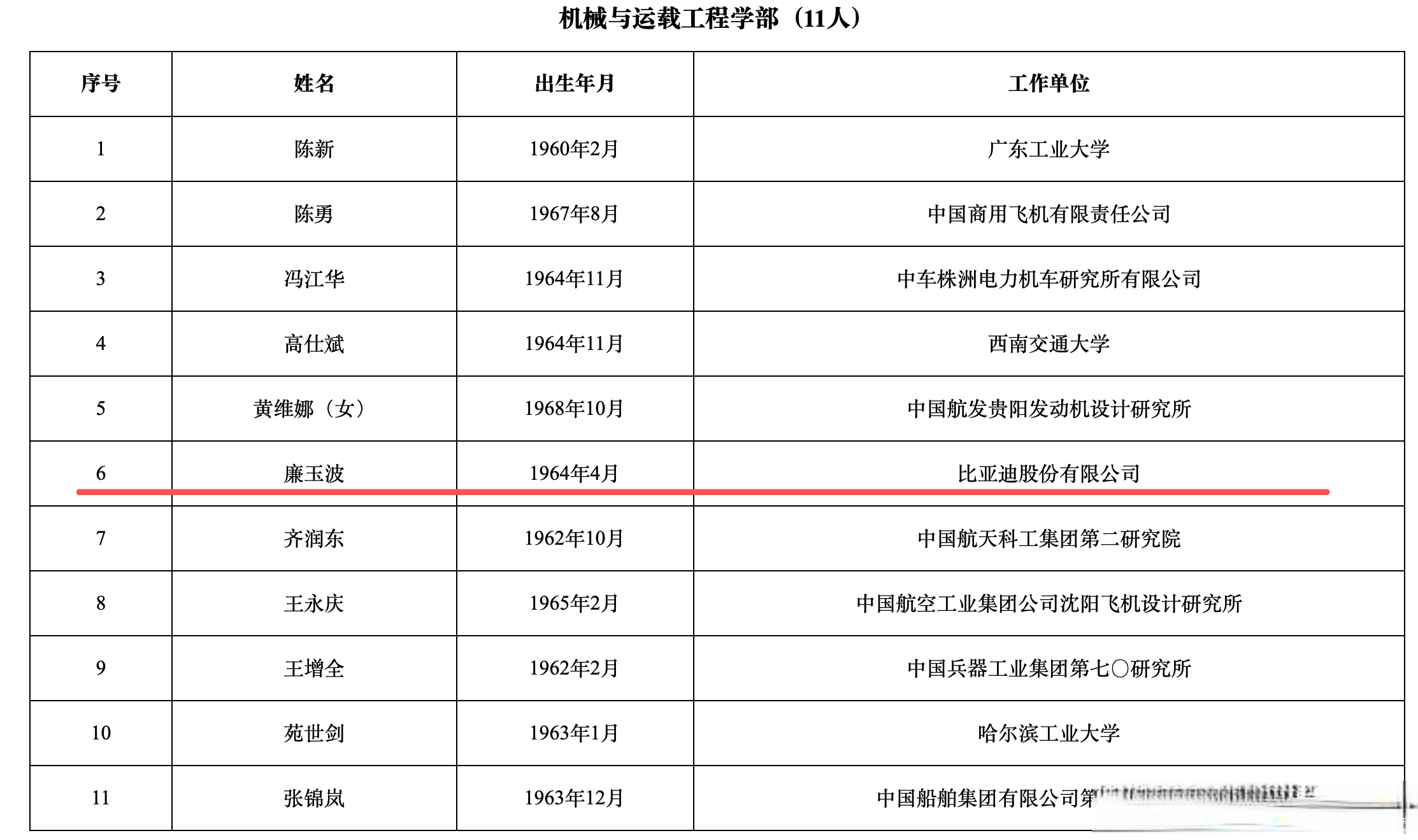 比亚迪廉玉波、宁德时代吴凯当选中国工程院院士!
