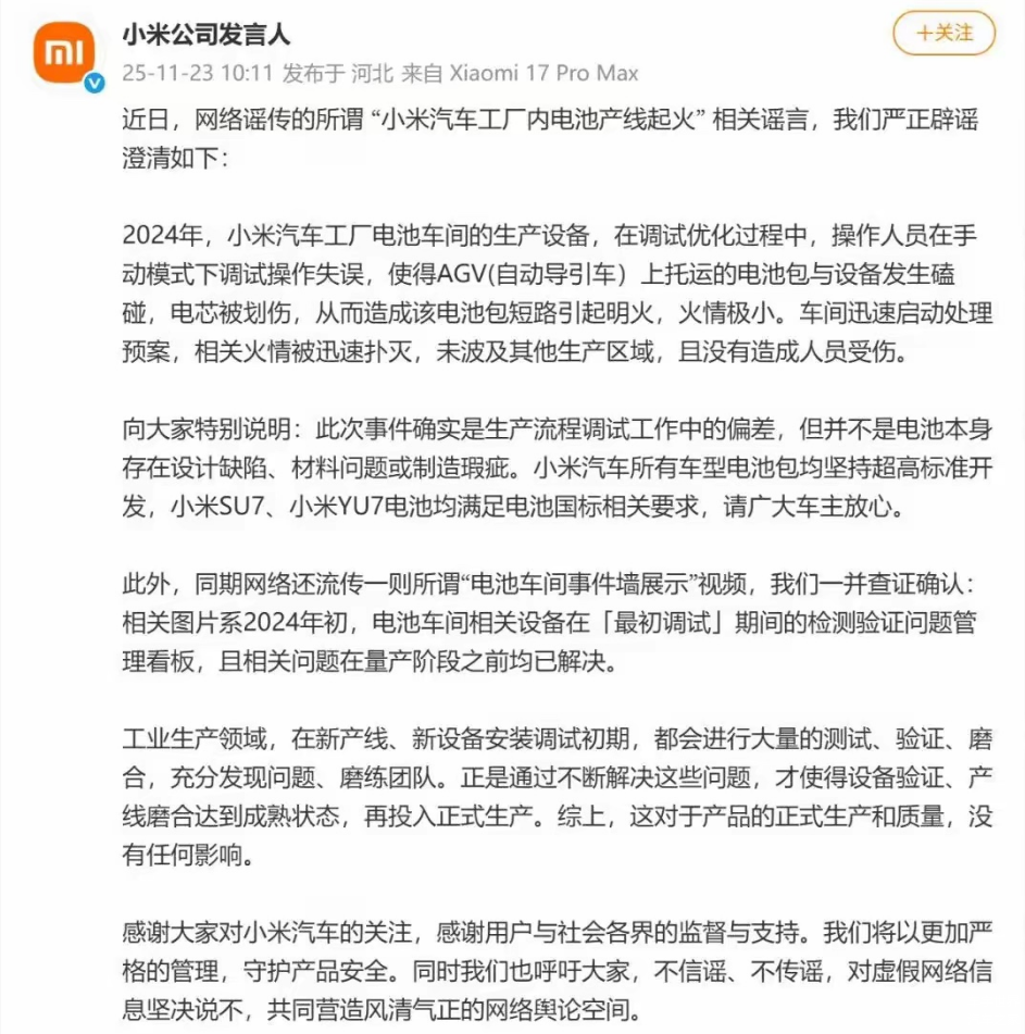 11月23日,小米公司官方发言人对近期网络流传的“小米汽车工厂内电池产线起火”传闻发布严正声明,详细说明了事件真相——2024年电池车间调试期间因操作失误导致的极小火情,并强调并非电池本身设计缺陷。