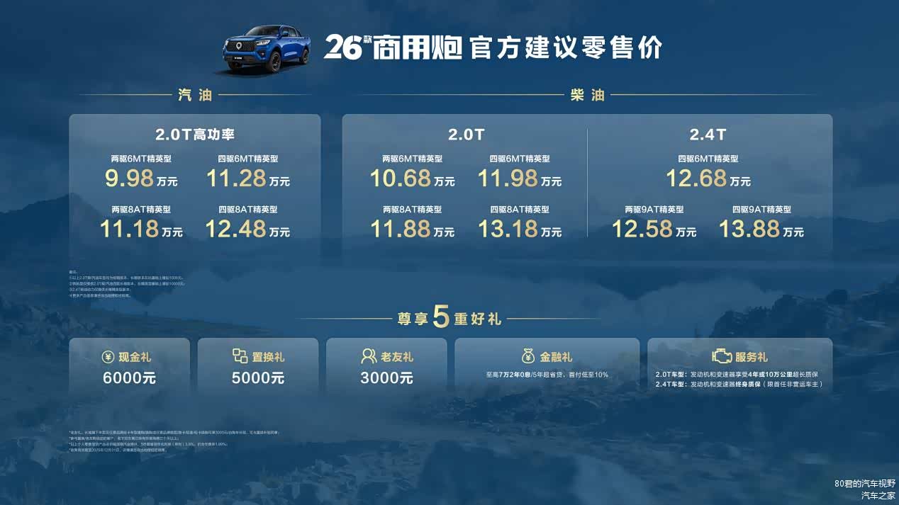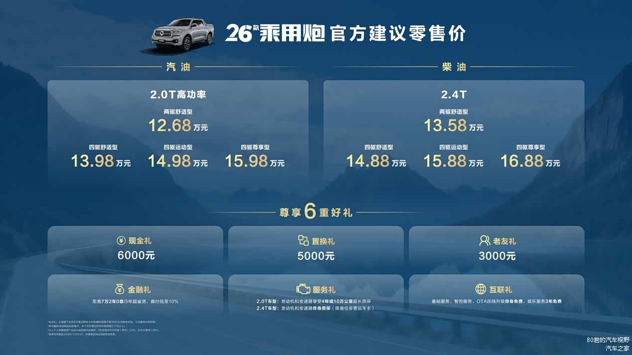 除了产品力的全面提升,此次上市的多重礼遇也诚意十足。商用炮用户可享五重大礼,乘用炮和越野炮更是有六重大礼加持,现金礼最高可达1万元,置换礼和老友礼也毫不吝啬,再加上金融礼、服务礼等,让购车门槛大幅降低。从开创乘用皮卡新品类到如今的全面焕新,2026款长城炮用更强的性能、更智能的座舱和更丰富的配置,再次证明了中国皮卡的硬实力。它不仅是宜商宜家的实用车型,更承载着人们对多元生活的向往,拉得动经济,装得下梦想。相信这款实力出众的冠军皮卡,会继续引领中国皮卡在全球市场绽放光彩。