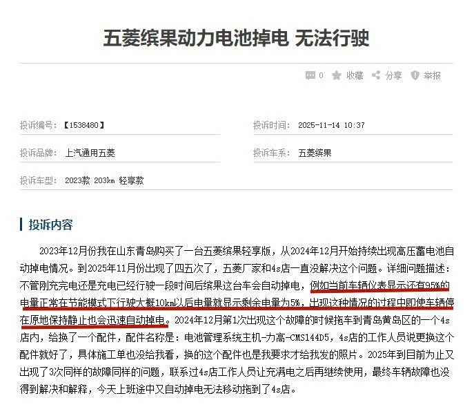 此外,还有车主投诉,2023年购买的五菱缤果,充电满95%后,行驶10公里后,就显示剩余电量为5%,即便停车也会快速掉电……