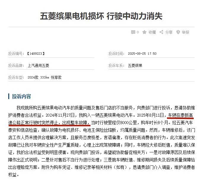还有在2025年8月11日,一辆五菱缤果车主在泰新高速公路上,也出现了车辆正常行驶时,突然停止,同样是因为车辆故障。
